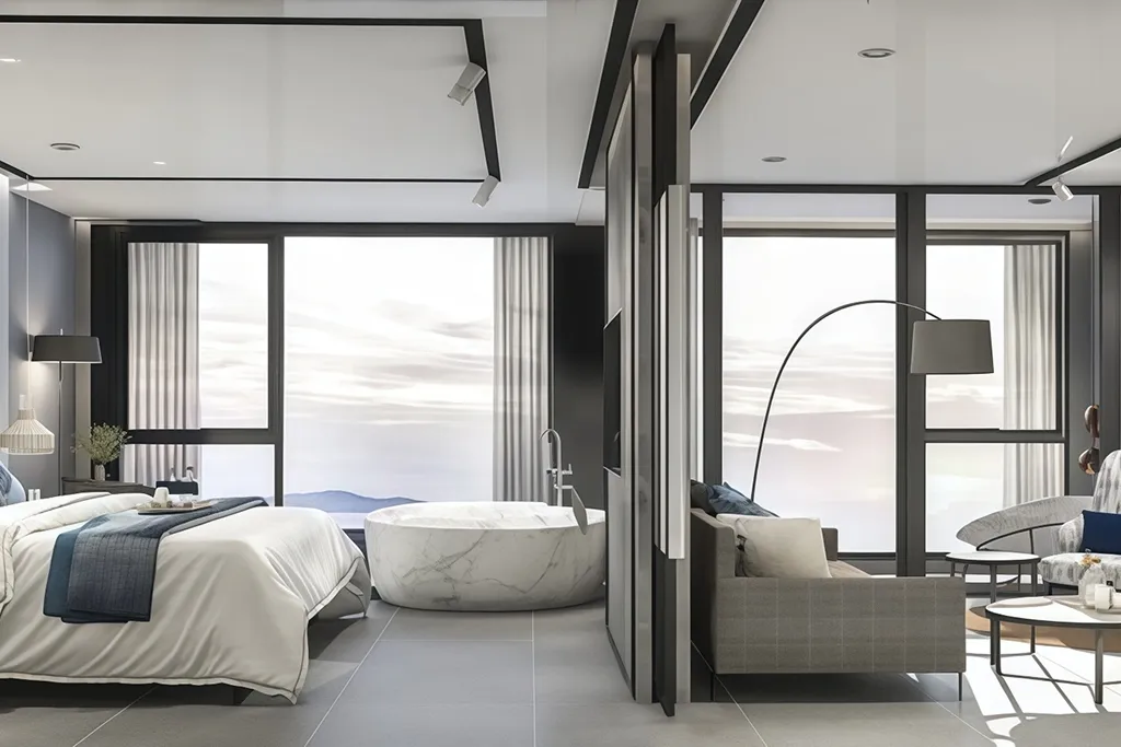 (พื้นที่ใช้สอย: การวางผังประสิทธิภาพสูง ประกอบด้วยห้องพักหรูและสิ่งอำนวยความสะดวกบนชั้นดาดฟ้า)