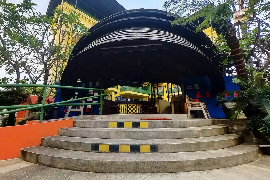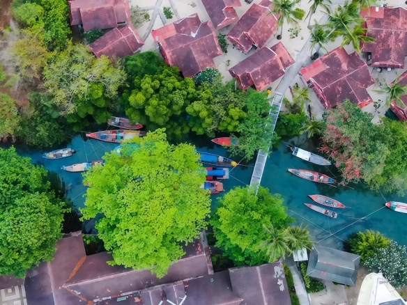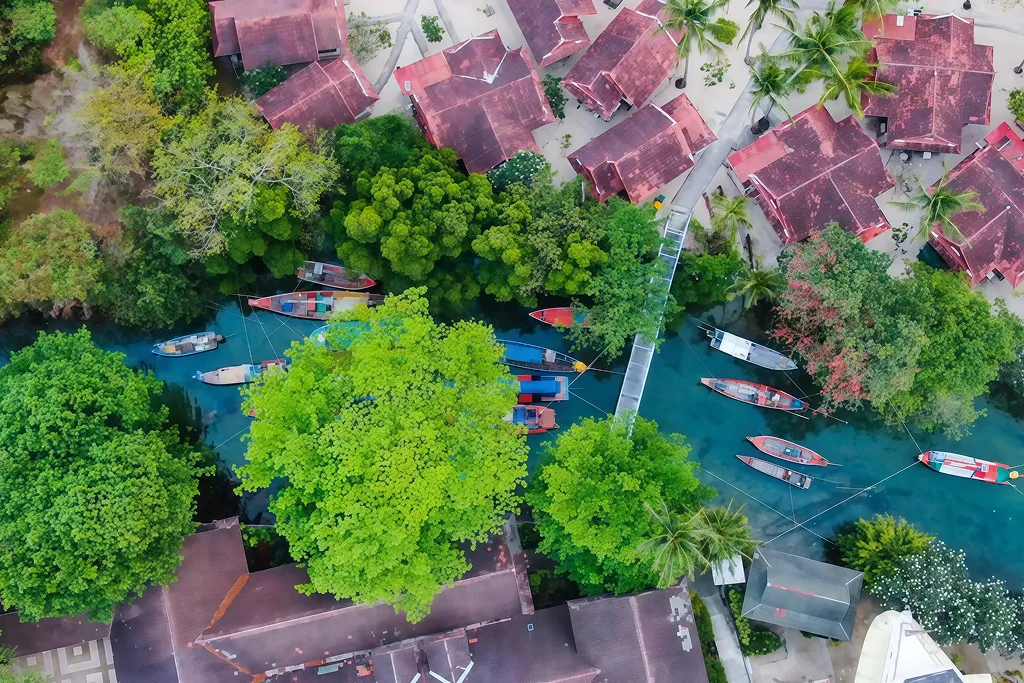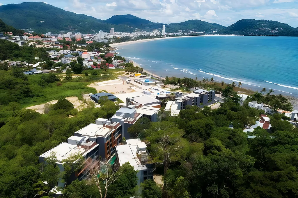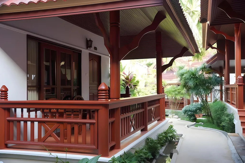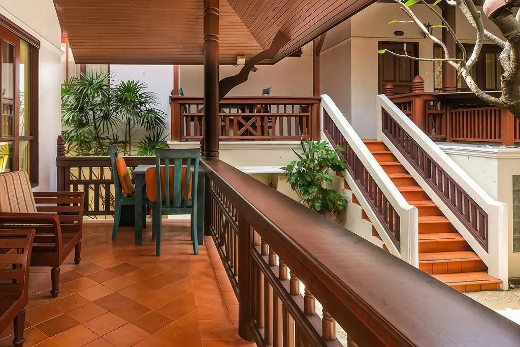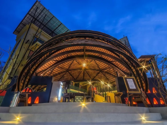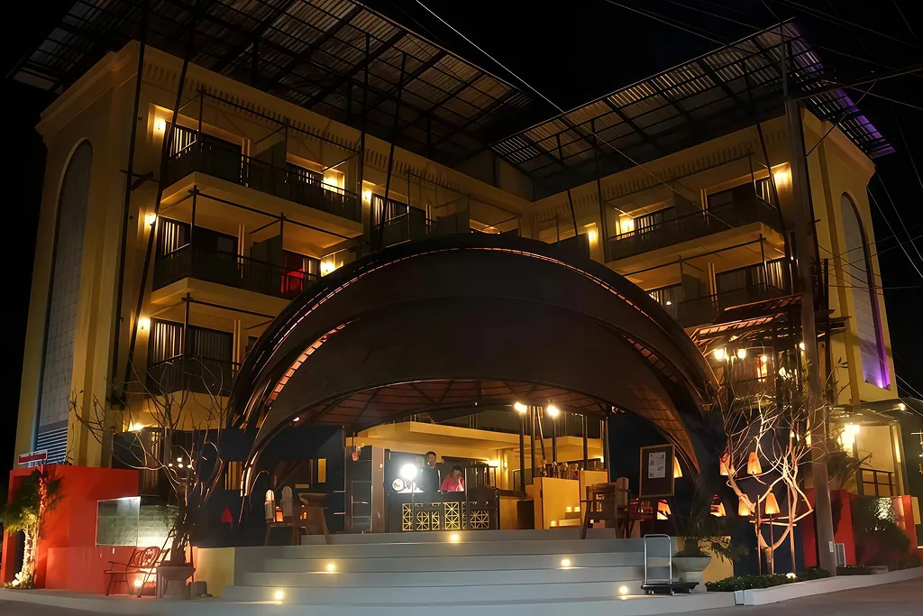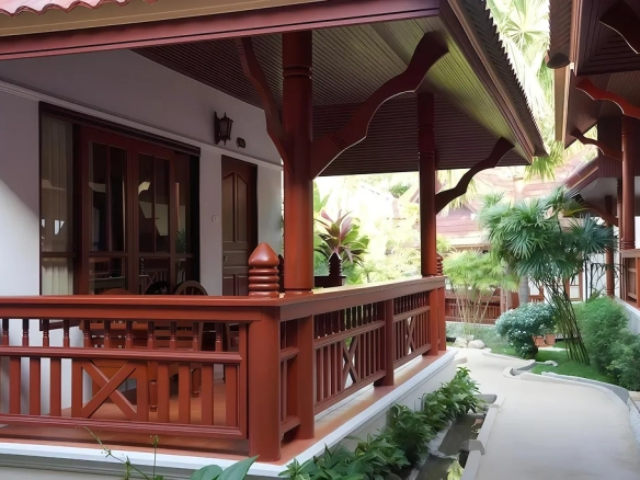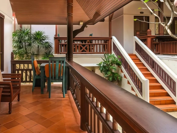 (สถาปัตยกรรมผสมผสานไทยร่วมสมัยกับภูมิทัศน์เขตร้อน อาคารแนวราบ รายล้อมด้วยต้นมะพร้าวและสวนเขตร้อน)