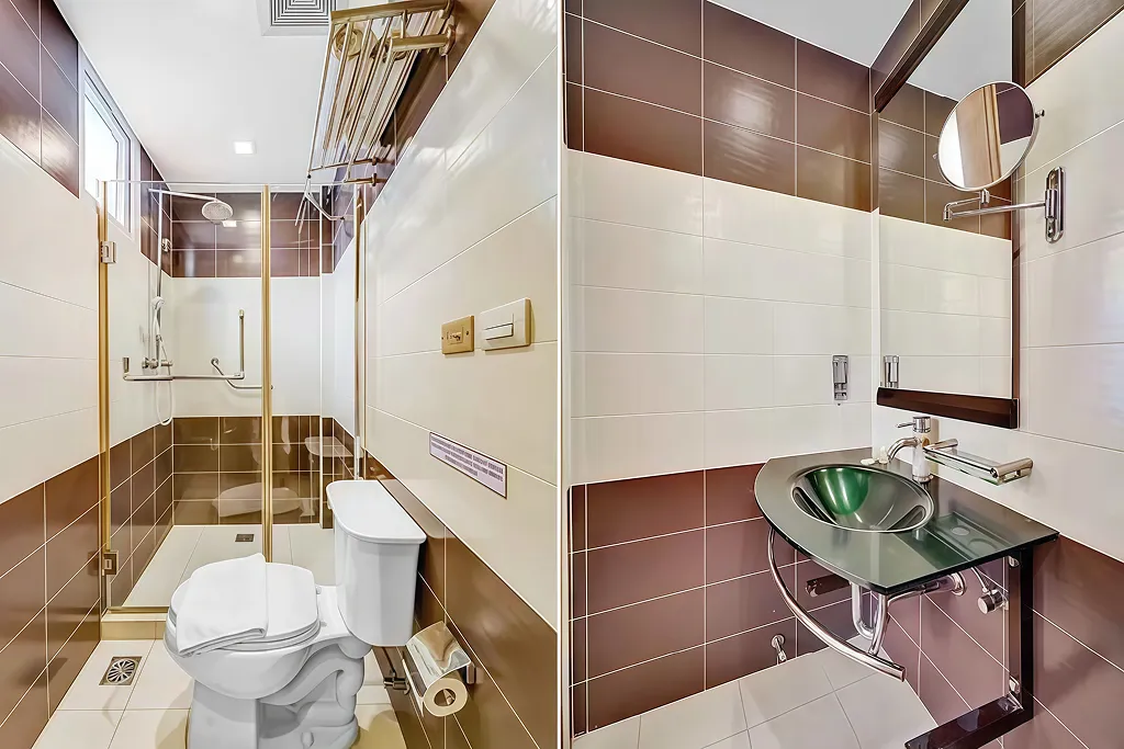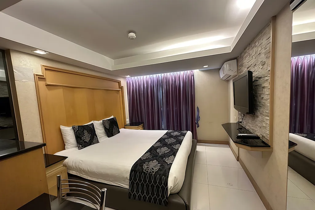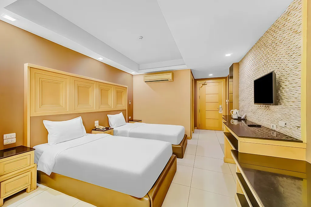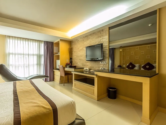 (ภายในห้องพักประกอบด้วย ทีวี ตู้เย็น เครื่องทำน้ำร้อน กระติกน้ำร้อน และตู้เซฟ)