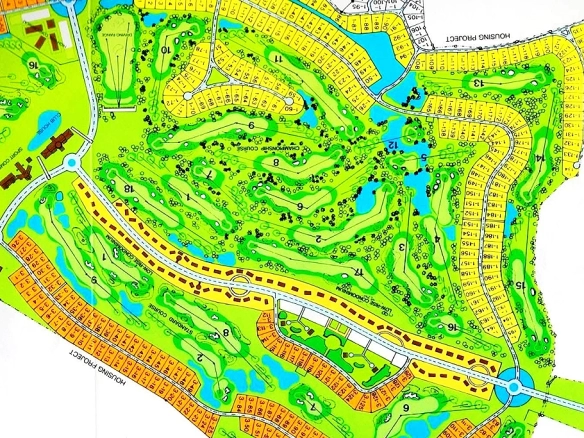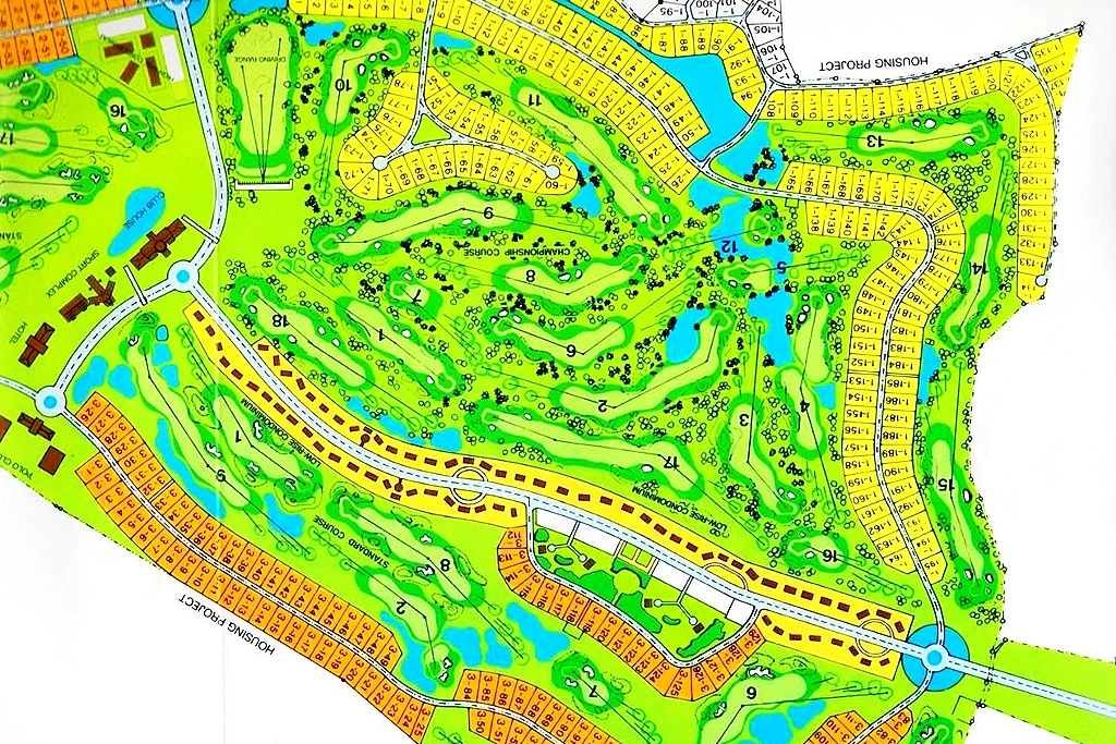 • Physical Characteristics: The site features an expansive landscape with existing water bodies and green zones according to the original golf course layout, as shown in aerial photographs and land boundary maps.