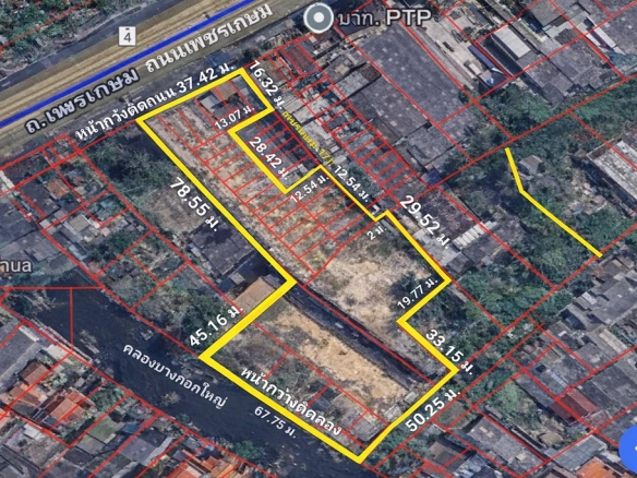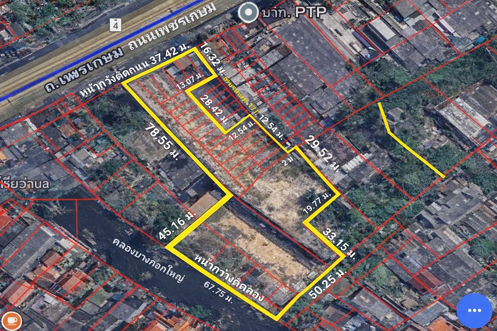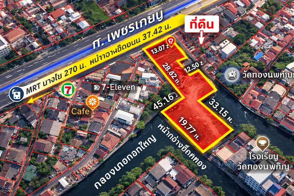 - A high-potential 3.97-rai development site (6,344 sq.m.) strategically located on Phet Kasem Road, featuring a unique combination of main road access and private canal frontage.